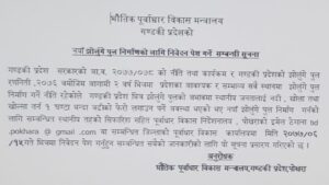 भौतिक पूर्वाधार विकास मन्त्रालयले सूूचना जारी गरी आगामी असोज १५ गते भित्रमा इमेलमार्फत समेत निवेदन पठाउन सकिने व्यवस्था गरिएको छ भने जिल्लास्थित पूर्वाधार विकास कार्यालयहरुमा सम्पर्क गर्न भनिएको छ ।