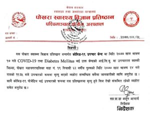सङ्क्रमण पुष्टि भई पोखरा स्वास्थ्य विज्ञान प्रतिष्ठान अन्तर्गतको पश्चिमाञ्चल क्षेत्रीय अस्पतालको कोभिड उपचार केन्द्रको सघन उपचार कक्षमा उपचाररत पोखरा–१९ का ६२ वर्षीय पुरुषको शनिबार राति मृत्यु भएको होे ।
