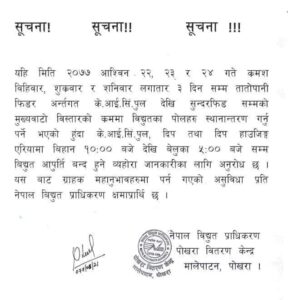 नेपाल विद्युत प्राधिकरण पोखरा वितरण केन्द्रले आज सूचना जारी गरी असोज २२ देखी २४ गतेसम्म तातोपानी फिडर अन्तर्गतका केआइसिँहपुल, दीप तथा दीप हाउजिङ एरियामा बिजुली आपूर्ति बन्द हुने जनाएको छ ।