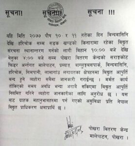 विन्ध्यवासिनी देखी हरिचोकसम्म सडक किनारका विद्युत पोल स्थानान्तरणका लागि विहान १० बजेदेखी साँझ ४ बजेसम्म विद्युत नआउने नेपाल विद्युत प्राधिकरण पोखरा वितरण केन्द्रले जनाएको छ ।