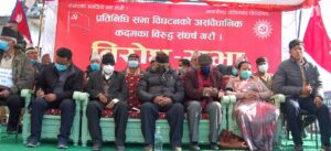 नेकपाको ७७ वटै जिल्लामा असंवैधानिक संसद् विघटनको विरोधमा आयोजना गरिएको विरोधसभा अन्तर्गत पोखराको चिप्लेढुुँगाबाट जुलुस निकालेर पृथ्वीचोकमा विरोधसभा आयोजना गरिएको थियो ।