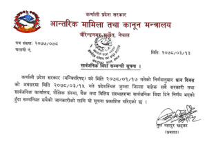 प्रदेश सरकार आन्तरिक मामिला तथा कानून मन्त्रालयले सोमबार सूचना जारी गर्दै मंगलबार जुम्ला बाहेकका प्रदेशका सबै जिल्लामा सार्वजनिक बिदा हुने जनाएको छ ।