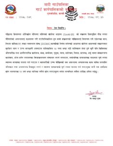 यसैगरी जारी विज्ञप्तिमा सार्वजनिक यातायातमा पूर्ण स्वास्थ्य मापण्डको पालना गर्न र महामारीका बेला अत्यावश्यक नपरि घर बाहिर ननिस्कन र खोप नलगाएका १२ वर्ष माथिका पालिकावासीलाई खोप लगाउन आह्वान समेत गरिएको छ ।