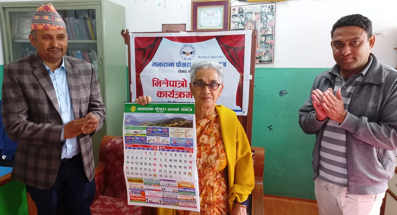 समाजका संरक्षक एवम् जेष्ठ नागरिक गंगादेवी लामिछानेले पोखरामा आयोजित एक समारोहका बीच भित्तेपात्रो लोकार्पण गर्दै नयाँ बर्षले सवैमा सुख, शान्ति,समृद्धि, सुस्वास्थ्य र दिर्घायुको कामना गर्नुभयो ।