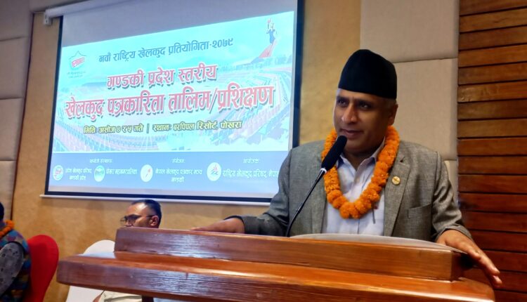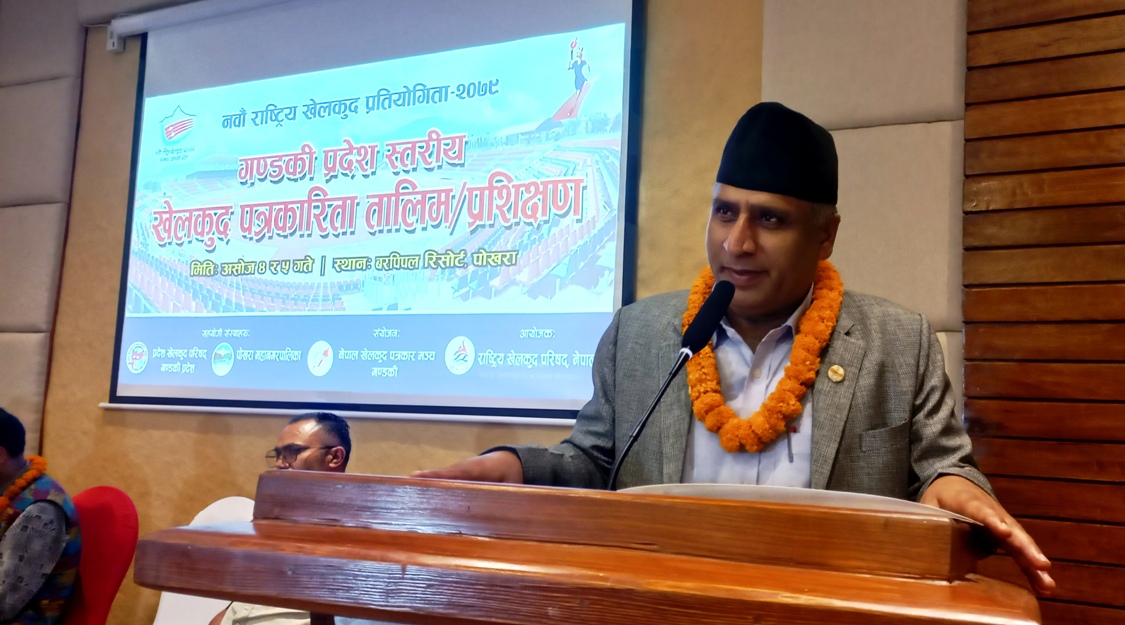 राष्ट्रिय खेलकुद परिषद्को आयोजना र खेलकुद पत्रकार मञ्च गण्डकीका संयोजनमा पोखरामा सञ्चालन भएको दुई दिनको खेल पत्रकारिता तालिमको आज समापन समारोहमा उहाँले चालू वर्षको रातो किताबमा विनियोजित रु एक करोड, प्रतियोगिताका लागि भदौ पहिलो साता उपलव्ध गराइएको र तीन करोड ४६ लाख र पछिल्लोपटक थप रु एक करोड ४० लाख निकासा गरिएको जानकारी दिनुभयो ।