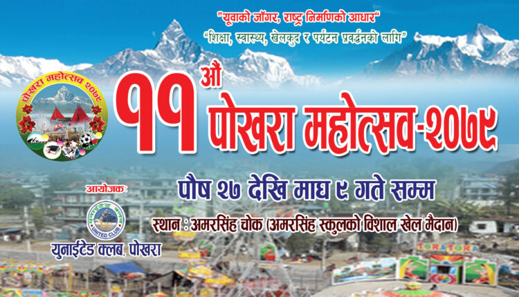 हिमाली आवाज । पोखराको अमरसिंह चौरमा आयोजना हुने एघारौ संस्करणको पोखरा महोत्सवको ६० प्रतिशत स्टल बुकिङ भएको छ । युनाईटेड क्लवको आयोजनामा आगामि पुषको २७ देखि माघको ९ गते सम्म अमरसिंह चौरमा आयोजना हुने एघारौं संस्करणको पोखरा महोत्सवका लागि स्टल खुल्ला गरिएको दोश्रो दिनमा ६० प्रतिशत स्टल बुकिङ सम्पन्न भएको महोत्सव स्टल ब्यवस्थापन उपसमिति संयोजक सिमा गुरुङले जानकारी दिनुभयो ।