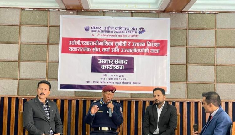 पोखरा उद्योग वाणिज्य संघले आइतबार यही विषयको वरपर रहेर अन्तरसंवाद कार्यक्रमको आयोजना ग¥यो । ‘उद्योगी÷व्यवसायीहरुमाथिका चुनौती र उत्पन्न निराशा ः सकारात्मक सोच,कर्म अनि उज्यालोतिरको यात्रा’ विषयक अन्तरक्रिया कार्यक्रममा अग्रज महिला उद्यमी रामकली खड्काले आग्रहको भाषामा भनिन्,‘व्यवसायीसँग ऋण त हुन्छ तर कर्जा उठाउने नाममा कर र भ्याटले छापा मार्दा पसलसम्म मात्रै छापा मारे हुन्थ्यो, साना नानीबाबुहरु सुत्ने कोठासम्म पुगेर खानतलासी नगरे हुने,त्यसले साना नानीबाबुलाई असर पु¥याउँछ !’