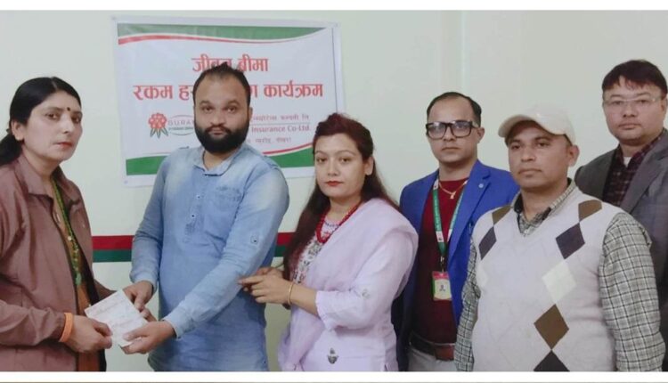 मृतकका परिवार रेखा वाग्लेलाई गुराँस लाइफका क्षेत्रीय प्रमुख हरि शर्मा पौडेल एवं कम्पनीका अभिकर्ता एम डि आर टी कमला केसीले संयुक्त रुपमा चेक प्रदान गर्नुभयो ।
