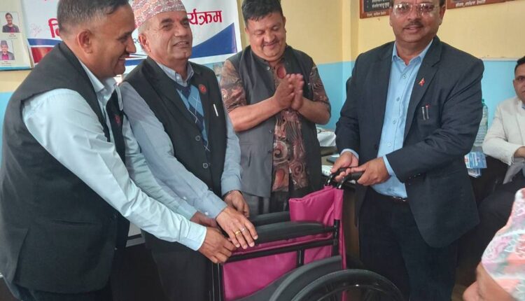 नेपाल लेखापढी कानुन व्यवसायी एशोसिएसनका केन्द्री सल्लाहाकार समिति संयोजक रामप्रसाद अधिकारी, पोखराका इकाईका अध्यक्ष दयाराम तिवारीले मालपोत कार्यालय कास्कीका प्रमुख रामचन्द्र अधिकारीलाई एक कार्यक्रमकाबीच सो ह्विलचियर हस्तान्तरण गर्नुभयो ।