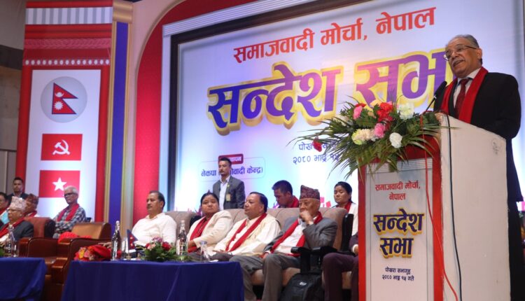 समाजवादी मोर्चा, नेपालद्वारा आज पोखरामा आयोजित गण्डकी प्रदेशस्तरीय सन्देश सभालाई सम्बोधन गर्दै उहाँले अर्थतन्त्र तहसनहस बनिरहेका अवस्थामा आँफूले सरकारको नेतृत्व लिएको बताउनुभयो ।