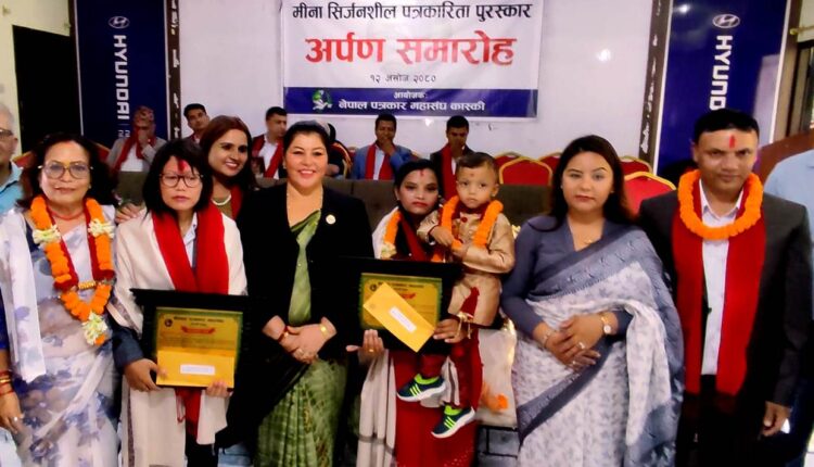 हिमाली आवाज । नेपाल पत्रकार महासङ्घ कास्की शाखामा स्थापित ‘मीना सिर्जनशील पत्रकारिता पुरस्कार’द्वारा पोखरामा क्रियाशील दुई महिला पत्रकार पुरस्कृत भएका छन् । विसं २०७९ को सो पुरस्कार पत्रकार बिनुकुमारी थापा ‘बिनु’ र विसं २०८० को बालकुमारी पौडेल ‘तारा’ लाई प्रदान गरिएको हो ।