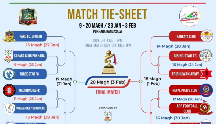 १२ टिमले भाग लिएको प्रतियोगितामा समूह ‘ए’ मा आयोजकसहित भुटान, थ्रि स्टार, मच्छिन्द्र, जावलाखेल युथ र मनाङ मस्र्याङ्दी छन् । फाइनल २० गते हुनेछ ।