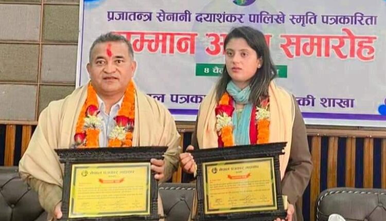 हिमाली आवाज । नेपाल पत्रकार महासङ्घ कास्की शाखाद्वारा सञ्चालित ‘प्रजातन्त्र सेनानी दयाशङ्कर पालिखे स्मृति पत्रकारिता सम्मान’बाट पोखराका दुई पत्रकार सम्मानित हुनुभएको छ । आइतबार यहाँ आयोजित समारोहमा प्रधानमन्त्री पुष्पकमल दाहाल ‘प्रचण्ड’ले पत्रकार दीपेन्द्र श्रेष्ठ र दिवङ्गत पत्रकार त्रिभुवन पौडेललाई मरणोपरान्त उक्त सम्मान प्रदान गर्नुभएको हो ।