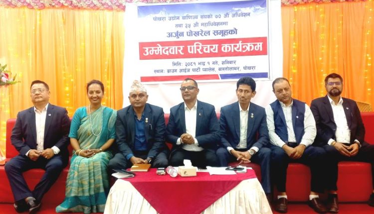 अध्यक्षका उम्मेदवार पोखरेलले संघको गरिमा कमजोर हुँदै गएकाले संस्थाको प्रभावकारीता वृद्धि गर्नका लागि आफू पुनः उम्मेदवार बनेर मैदानमा उत्रिएको बताउनुभयो। “पोखरा उद्योग वाणिज्य संघको साख जोगाउन म चिन्तित छु । त्यसैले यही मनसायले फेरी नेतृत्वका लागि निर्वाचमा होमिएको छु । ” पोखरेलले भन्नुभयो । अध्यक्षका प्रत्याशी पोखरेलले अघिल्लो पटकको निर्वाचनमा खेप्नुपरेको पराजयले पाठ सिकाएको बताउनुभयो ।