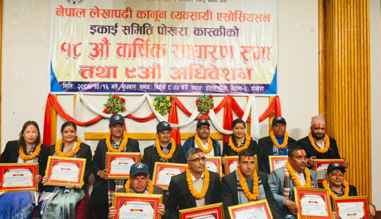 नेपाल लेखापढी कानुन व्यवसायी एशोसिएसन कास्की पोखरा इकाईको अधिवेशन तथा साधारणसभाको कास्की जिल्ला अदालतका जिल्ला न्यायाधीश चन्द्र कान्त पौडेलले उद्घाटन गर्नुभएको थियो । इकाईका अध्यक्ष दयाराम तिवारीको अध्यक्षतामा भएको कार्यक्रममा एसोसिएसन केन्दिय कार्यसमितिका वरिष्ठ उपाध्यक्ष गोविन्द प्रसाद पोखरेल , केन्द्रीय उपाध्यक्ष तथा गण्डकी प्रदेश संयोजक सरोज देवकोटा ,केन्द्रीय सचिव हरि प्रसाद शर्म,केन्द्रिय महिला बिभाग प्रमुख माया देबि सोति लगायतलको उपस्थिति रहेको थियो ।
