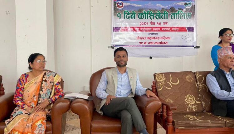 पोखरा महानगरपालिका १२ नम्बर वडा कार्यालयले कौसी खेतीका लागि तालिम कार्यक्रम सञ्चालन गरेको छ । वडा भित्रका महिलालाई आयआर्जनमा जोड्न तालीम दिइएको वडाध्यक्ष सन्तोष बास्तोलाले बताउनुभयो । उहाँका अनुसार यो तालिमको उद्देश्य महिलाहरुलाई आर्थिक रूपले सशक्त बनाउन र घरै बसेर आय आर्जन गर्ने अवसर प्रदान गर्नु हो ।