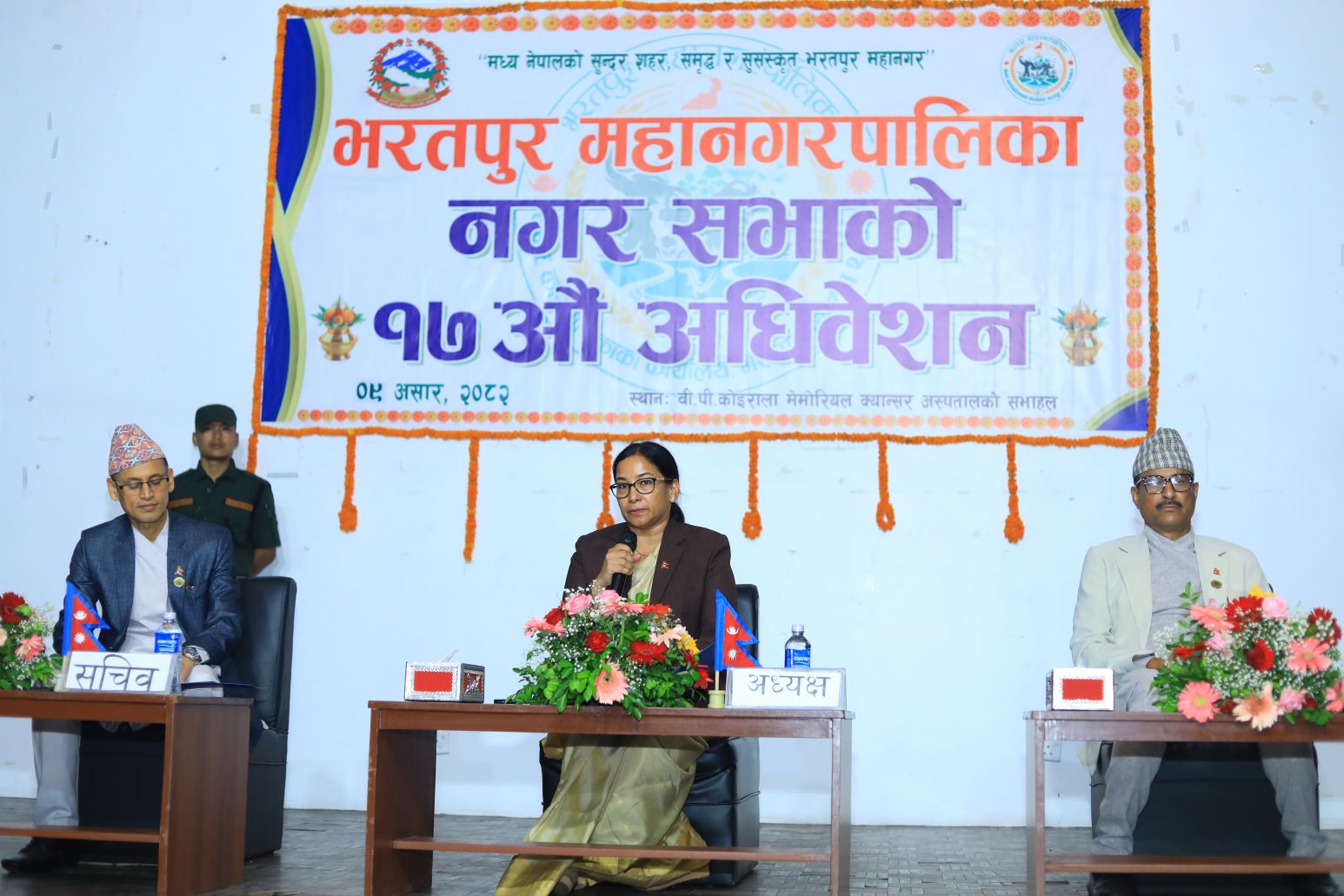 १७ औँ नगर सभाले भरतपुर महानगरपालिकाको लेखा समिति, विधायन समिति, सुशासन समिति, न्यायिक समिति तथा लेखा समितिको प्रतिवेदन र राजस्व र व्ययको अनुमान (बजेट), आर्थिक विधेयक २०८२ र विनियोजन विधेयक २०८२ पारित गरेको छ ।