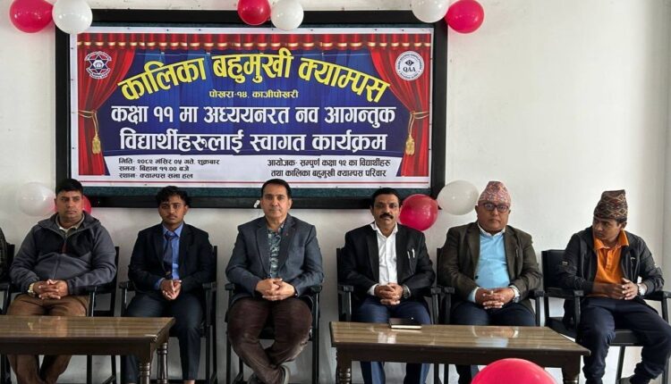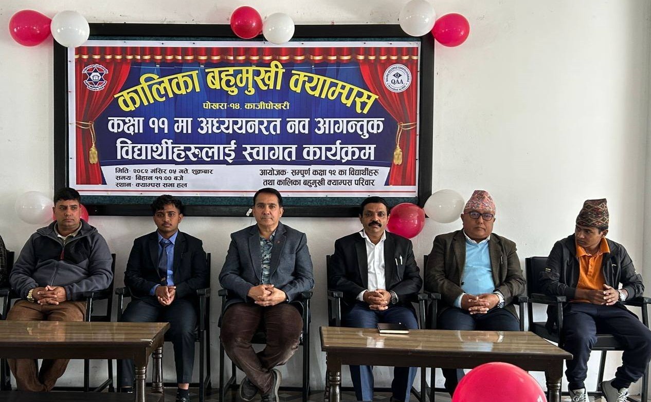 हिमाली आवाज । कालिका बहमुखी क्याम्पस, पोखरामा कक्षा ११ मा नयाँ भर्ना भएका विद्यार्थीहरुका लागि स्वागत कार्यक्रम शुक्रबार सम्पन्न भएको छ । कार्यक्रम उत्प्रेरक दीपेन्द्र पहारीले कलेजमा सिकेका ज्ञानहरुले समग्र जीवनका लागीनै जग बसाल्ने कुरा बताउँदै आगामी दिनमा एक असल विद्यार्थीले निभाउनुपर्ने भुमिकाका बारेमा प्रकाश पार्नुभयो ।