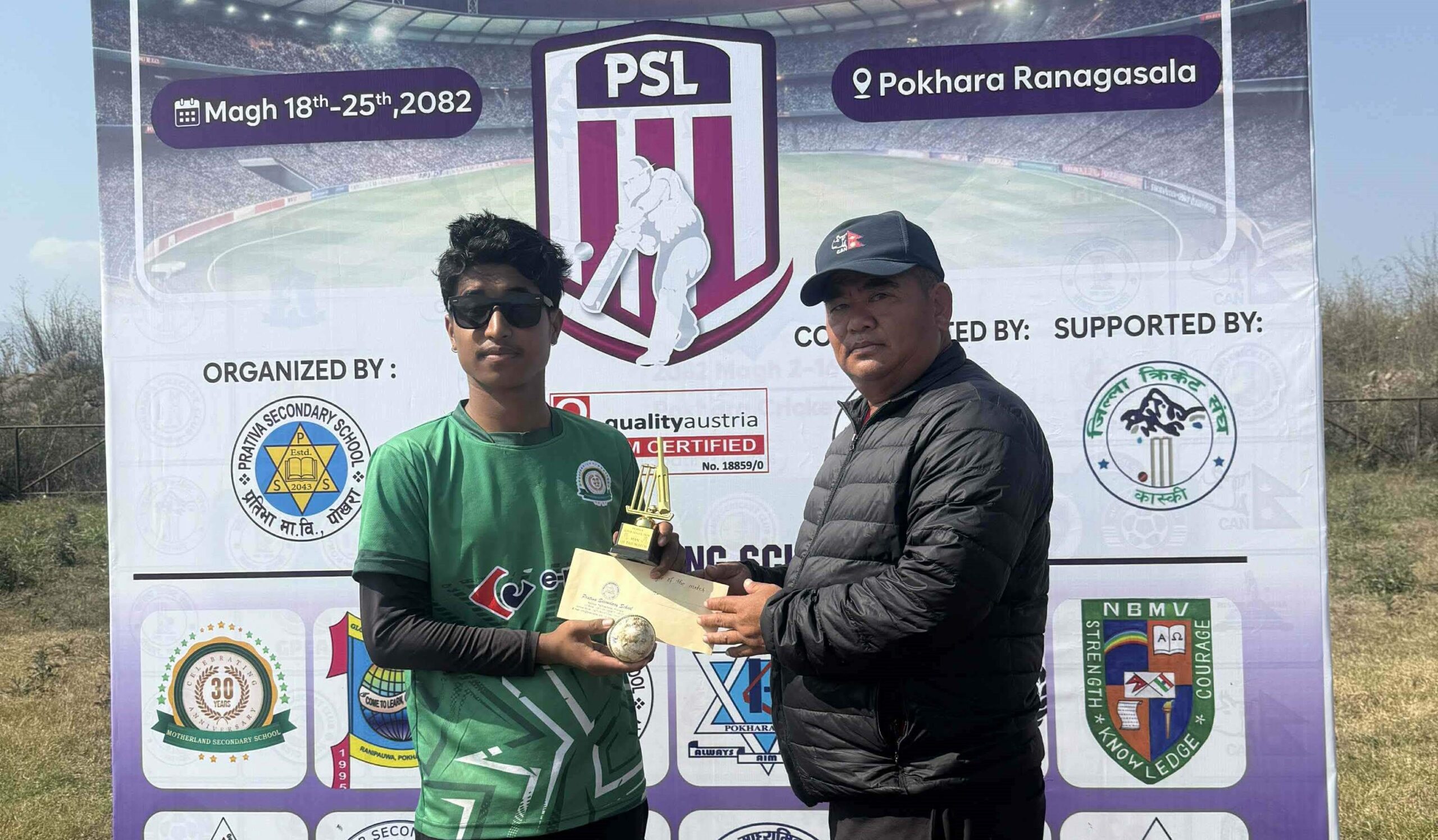 खेलमा मदरल्याण्डका ६ विकेटधारी विलोभ मल्ल प्लेयर अफ द म्याच घोषित भए ।