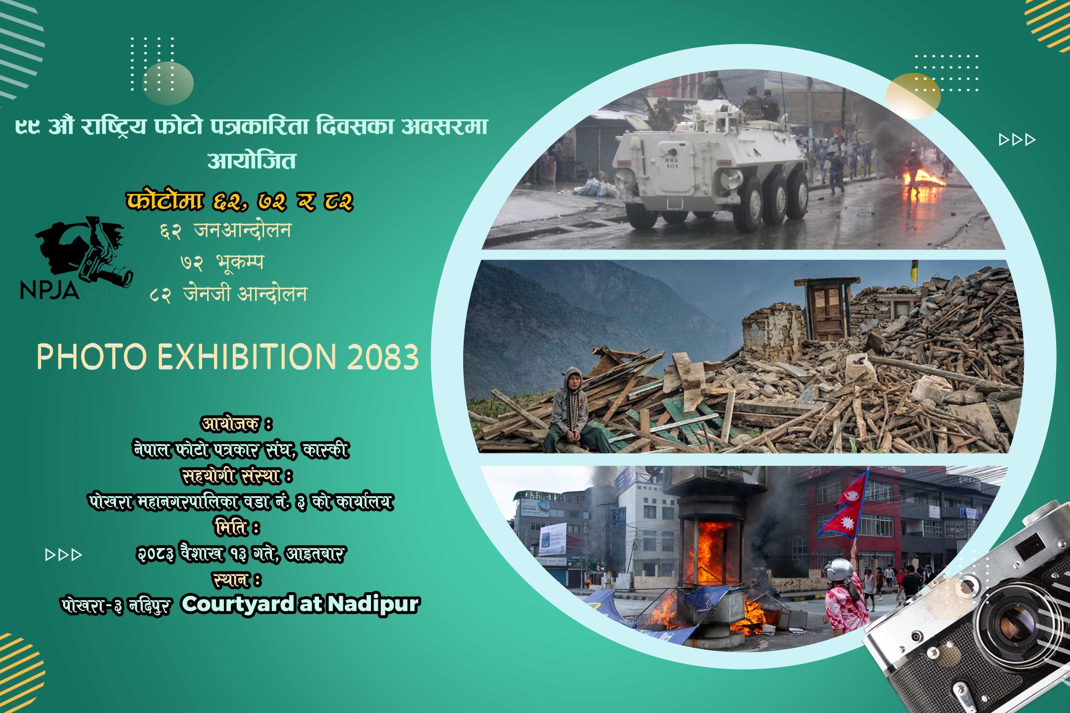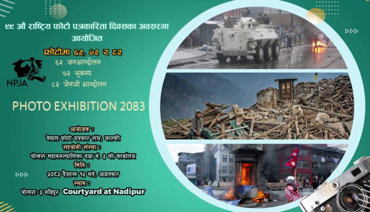 फोटो पत्रकारिता दिवसका अवसरमा पोखरा ३ नदिपुरस्थित कोर्टयार्ड (मिनमार्ट) प्रांगणमा वैशाख १३ गते आइतबार ‘फोटोमा ६२,७२ र ८२’ शीर्षकको फोटो प्रदर्शनी गर्न लागिएको संस्थाका अध्यक्ष राम गुरुङले जानकारी दिनुभयो ।